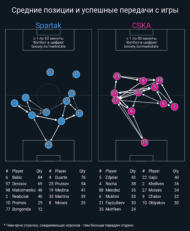 В середине тайма «Спартак» стал немного корректировать игру впереди. Промес и Бонгонда стали чаще меняться позициями – Квинси сваливался налево, а Тео оставался в середине. Это повлияло в лучшую сторону. До этого Промес находился в полной изоляции – длинные передачи в его сторону не работали, а по-другому ЦСКА не позволял доставлять мяч. Промес и Бонгонда были настолько отрезаны от остальной команды в начале матча, что это видно по карте средних позиций игроков даже на дистанции 60 минут.
