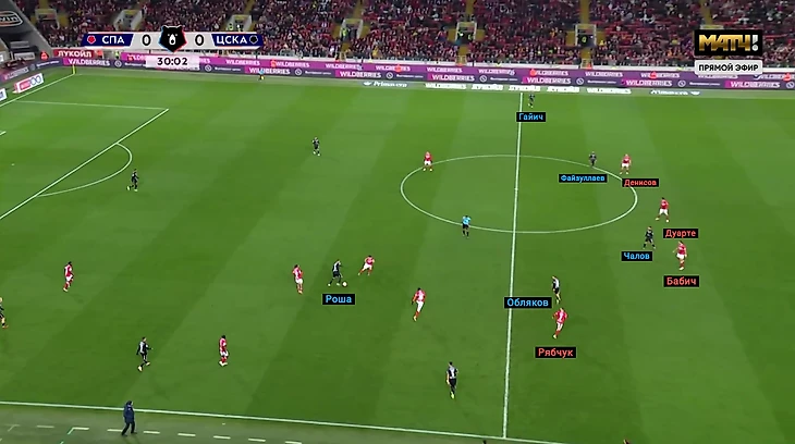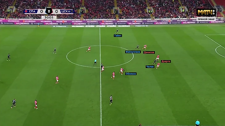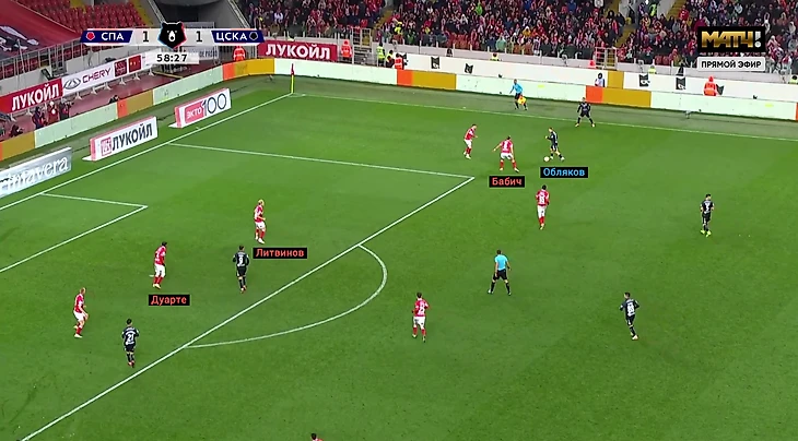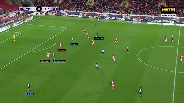 А когда Обляков принимал мяч, нападающие уводили Дуарте и Денисова, делая рывок за спину.