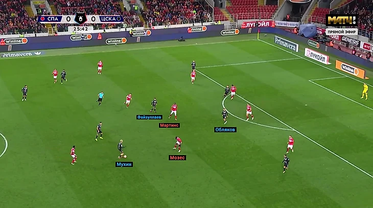 С самого начала матча в таком сочетании у «Спартака» не получалось практически ничего. ЦСКА не позволял проходить прессинг и даже Максим Мухин, которому приходилось играть правого центрального защитника, не был слабым звеном. Находясь под давлением, «Спартак» несколько раз использовал длинные передачи в его зону, но полузащитник почти не ошибался.
