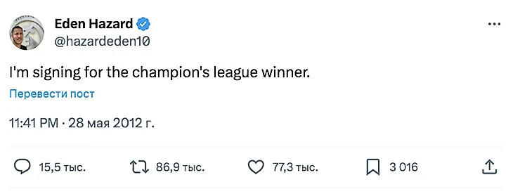 Лето 2012-го Азар начинал главной трансферной целью всех топ-клубов Европы. Убедительнее всех был Роман Абрамович, и уже 4 июня «Челси» объявил о переходе за 32 млн фунтов. Эден анонсировал переход чуть раньше, 28 мая он твитнул: «Перехожу к победителям Лиги чемпионов».
