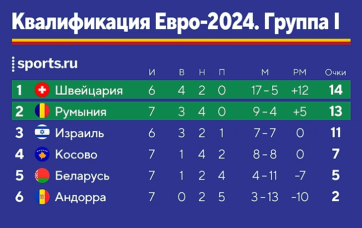 15 октября Швейцария сыграет дома с Беларусью, а Румыния примет Андорру. Судьба матча Косово – Израиль пока неизвестна. Похоже, перед ноябрем у израильтян будет сразу четыре несыгранных матча – играть еще предстоит против Румынии и Андорры.