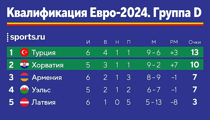 Здесь вся борьба еще впереди. 15 октября Турция примет Латвию, а Уэльс – Хорватию. В ноябре Турции останется сыграть в Уэльсе, а Хорватии – с Латвией и Арменией. У армян еще будет матч против валлийцев.