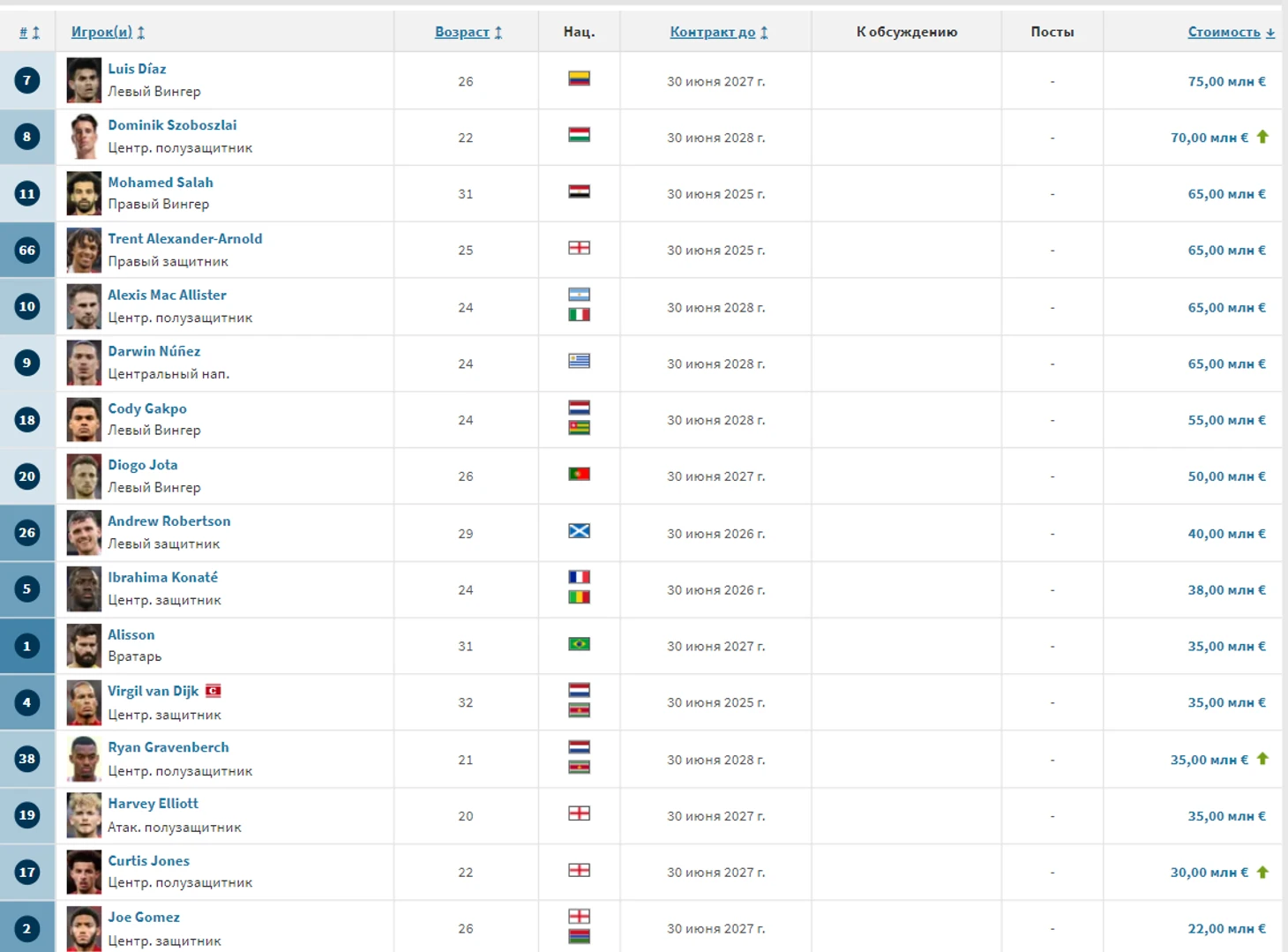 А вот как выглядит топ самых дорогостоящих игроков «Ливерпуля» по версии Тransfermarkt: