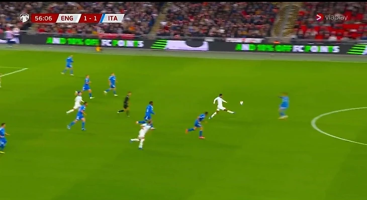 А уже на 57-й минуте англичане вышли вперед. Команда показала красивую комбинацию. Получив мяч, Беллингем практически сложился в эмблему Бундеслиги, чтобы перебросить мяч через соперника.