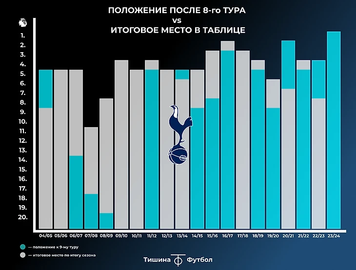 Тоттенхэм выдал лучший старт в своей истории АПЛ. Решил посмотреть — а как часто Тоттенхэм оказывался ниже места, занимаемого ими после 8-го тура? Спойлер — редко.