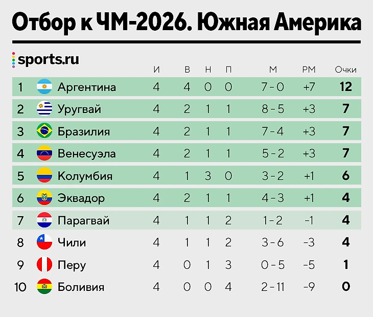 Есть явный фаворит – Аргентина выиграла все четыре матча и оторвалась от второго места на пять очков. Здорово стартовала Венесуэла, Бразилия уже потеряла пять очков, Чили вне зоны квалификации.