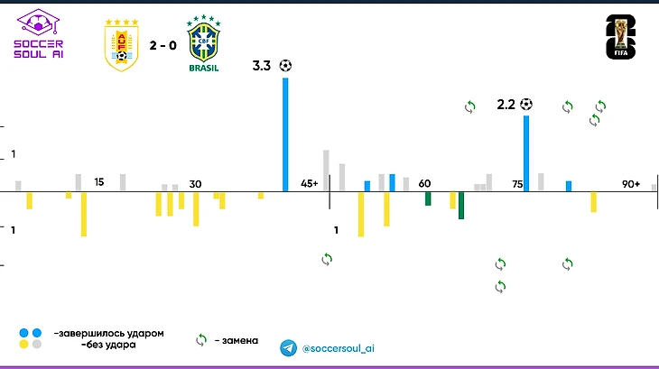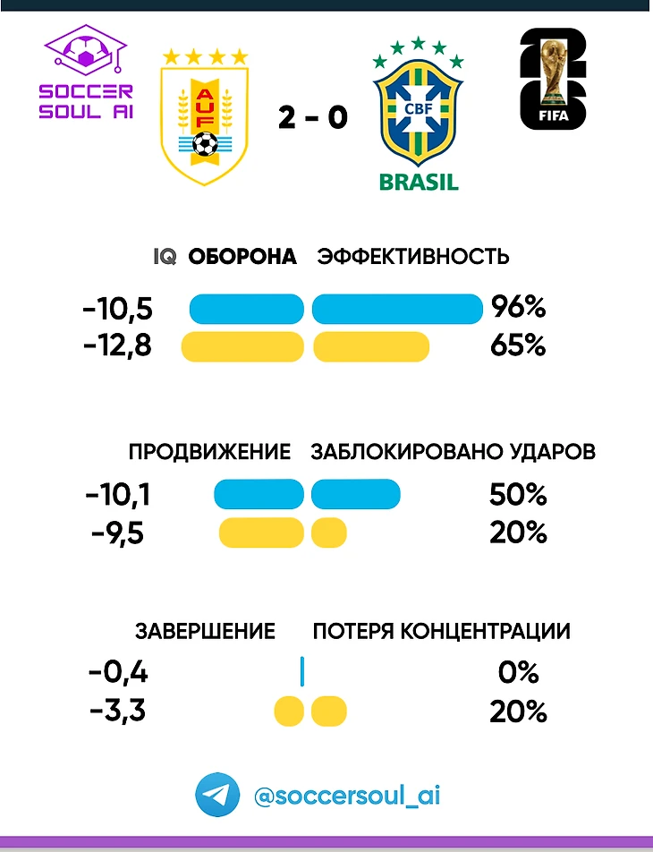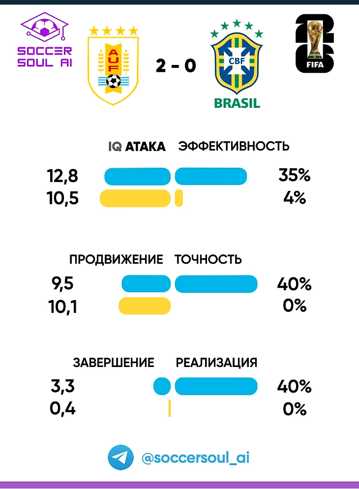 Метрика эффективности наглядно показывает, кто по итогу оказался продуктивнее. Столь низкий процент, как у Бразилии встречается крайне редко – Уругвай закрыл сопернику все подходы к собственным воротам.
