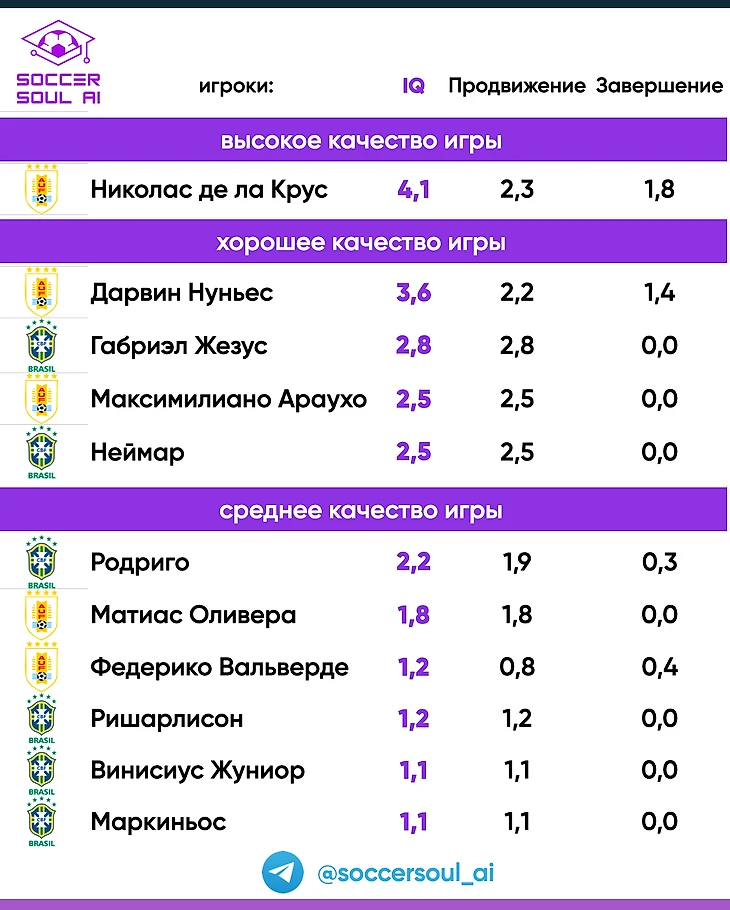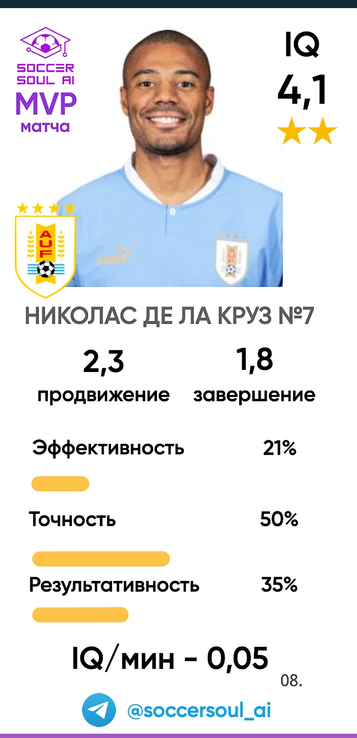💡 Как MVP матча, мой выбор - Николас де ла Крус (Уругвай) с показателем IQ = 4,1 балла. Футболист сыграл достаточно универсально, как в фазе продвижения (2,3), так и в фазе завершения (1,8).