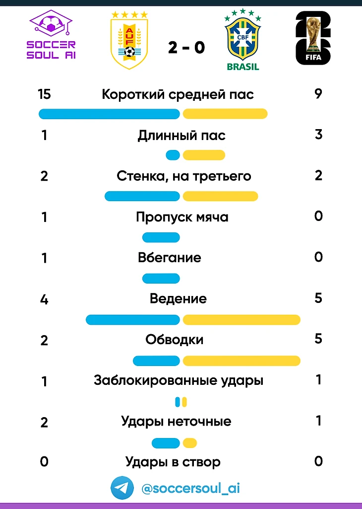 Уругвай был чуть успешнее в использовании простых командных взаимодействий, а Бразилия преобладала в индивидуальном движении мяча.