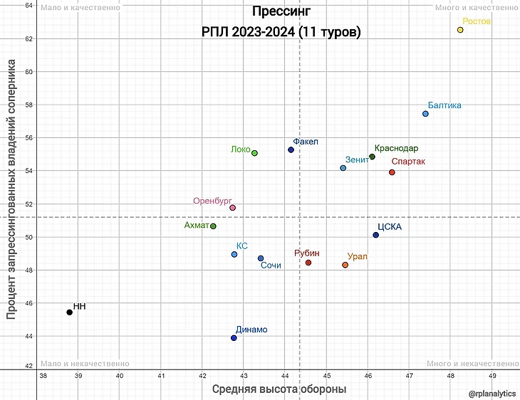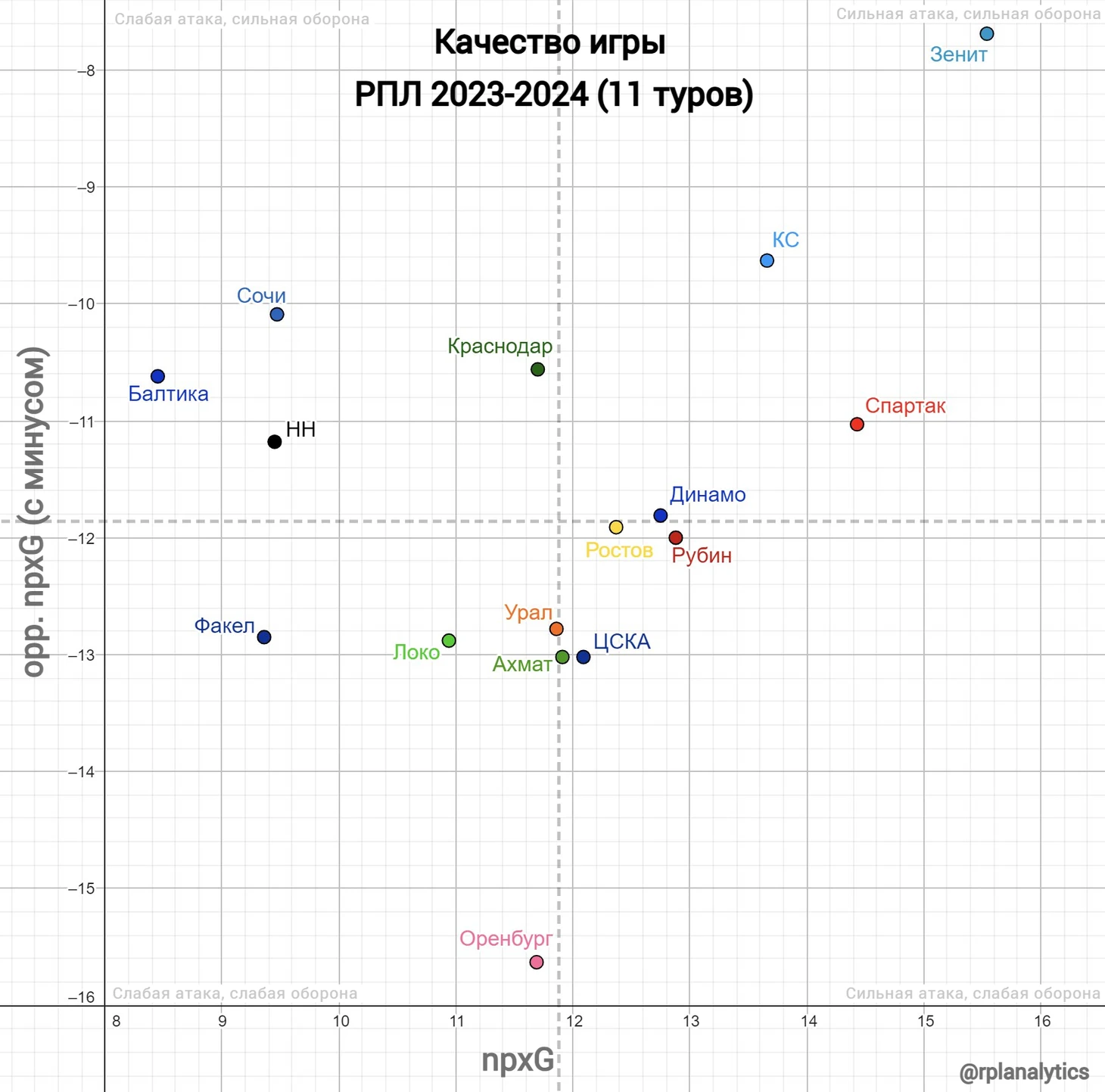 В прошлую международную паузу я разбирал прошедший отрезок РПЛ (на тот момент 7 туров) и анализировал игру каждой команды. Сейчас я сделал то же самое – обновил данные и снова оценил стилистические особенности и качество основных аспектов игры всех 16 команд. Сегодня больше внимания будет уделено динамике. Многие причины, по которым команда находится слишком высоко или слишком низко уже были описаны в предыдущем материале, поэтому сейчас больше внимания будет уделено динамике. Для этого везде будут прикреплены старые графики (7 туров) и обновлённые (11 туров).