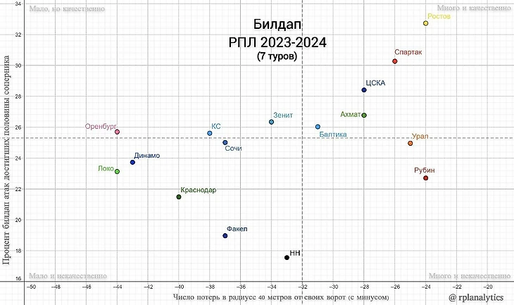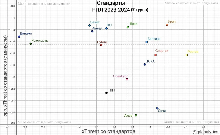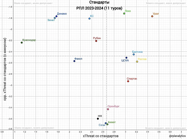 Лучшими по эффективности стандартов всё так же остаются «Локомотив» и «Урал». Пожалуй, только этот аспект позволяет команде Гончаренко оставаться в середине таблицы, ведь ни по одному другому показателю «Урал» не находится высоко. Главный тренер пытался менять игры команды, чтобы избавиться от этой зависимости, но в итоге «Уралу» пришлось откатиться к старым настройкам.