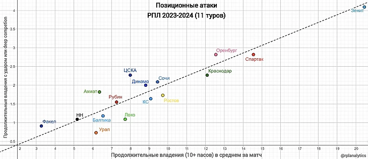 Высокое место «Факела» по реализации продолжительных владений объясняется крайне малой выборкой. Когда команда не проводит позиционные атаки, их качество почти не оказывает влияния на игру.