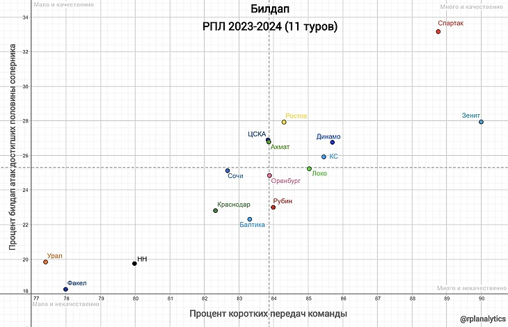 Чтобы оценить то, насколько качественно команда умеет преодолевать прессинг оппонента, будем использовать похожую систему. Теперь показателем, отвечающим за качество, будет процент билдап атак (тех, которые команда начинает на своей трети), достигших чужой половины поля. Стилистические особенности игры будет описывать процент коротких передач команды. В прошлый раз я использовал число «высоких» потерь (в радиусе 40 метров от своих ворот). Поэтому в данном случае сравнение графиков по оси Х неуместно.