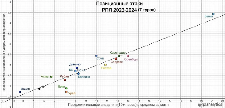 «Зенит» опустился ниже среднего по эффективности и это тоже логично. Ставка на быстрые переходы и более оборонительный стиль приводят к таким изменениям. Но, как и в ситуации с «Факелом», количество продолжительных владений первостепенно. Поэтому даже с такой реализацией позиционных атак «Зенит» создаёт больше многих конкурентов.