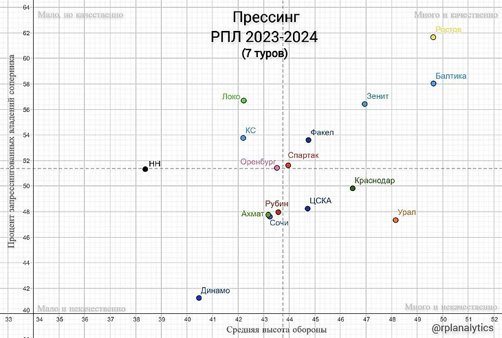 Качество прессинга «Крыльев» и «Пари НН» ощутимо снизилось. Регресс не связан с изменением стиля: средняя высота обороны осталась на том же уровне. Тут сказывается малая выборка (7 и 11 туров) и особенности игры команд, против которых приходилось играть. На более длинной дистанции становится видно, что выманивать в прессинг эти команды достаточно выгодно. Но заставить Юрана сыграть смелее без мяча почти невозможно.