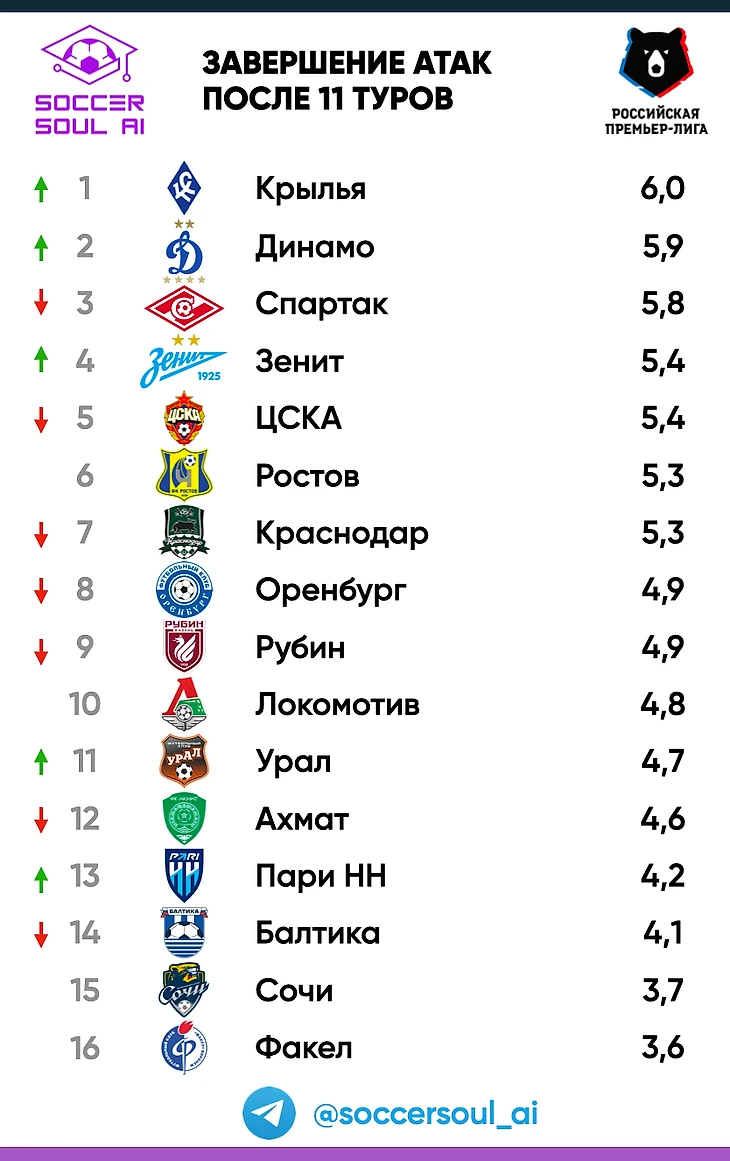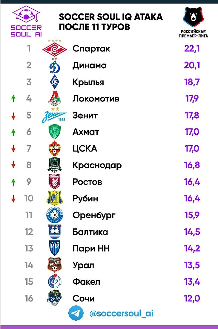 По качеству атакующей игры в чемпионате лидируют Спартак и Динамо с показателями 22,1 и 20,1 соответственно. Эти команды демонстрируют зрелищный и динамичный футбол, правда не всегда приносящий очки.