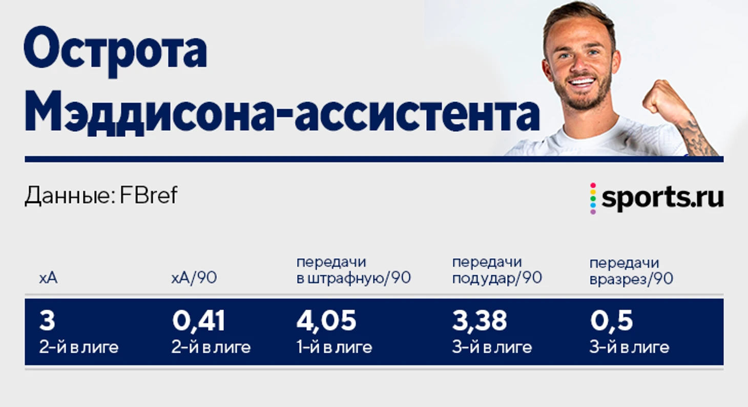 Мэддисон – главный по креативу и созданию остроты, причем не только в клубе, но и в лиге. Джеймс – второй в лиге по xA (ожидаемые ассисты), xA/90 и первый по передачам в радиус 20 метров и в штрафную площадь.