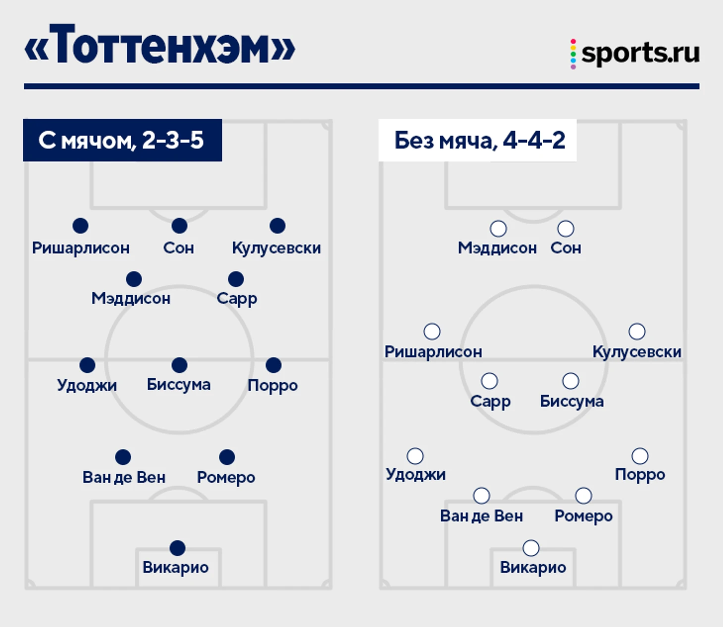 Главные принципы: высокий, интенсивный прессинг и позиционная игра. Без мяча «Тоттенхэм» прессингует по схеме 4-4-2, Мэддисон выдвигается на одну линию к нападающему. Когда же команда с мячом, то расстановку лучше всего описывает схема 2-3-5, причем оба крайних защитника, Удоджи и Порро, идут в полуфланги и образуют треугольники: Удоджи-Мэддисон-левый вингер и Порро-Сарр-Кулусевски.
