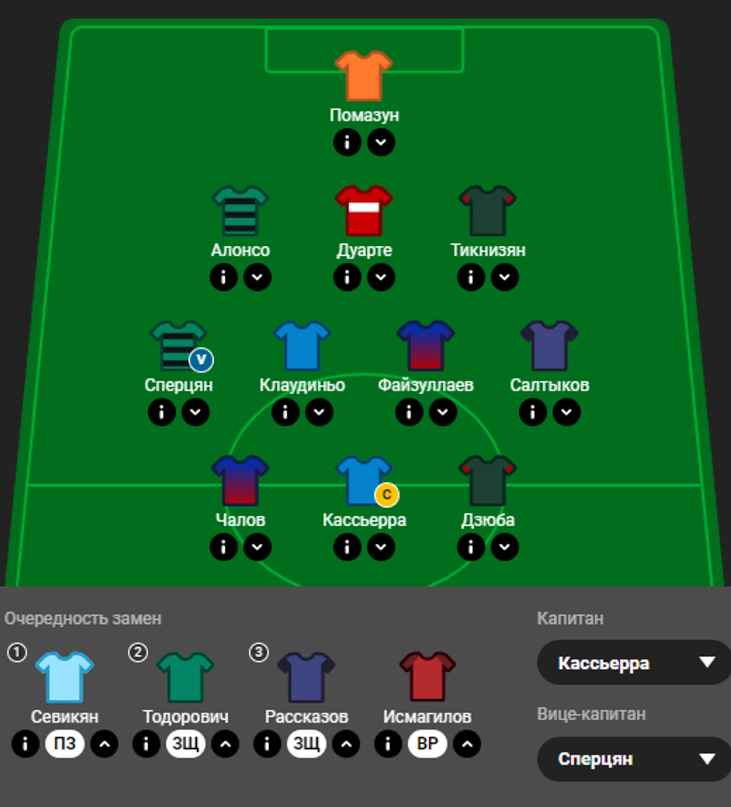 На 12-ый тур, с учётом того, что в запасе у меня ещё имеется Федя Чалов, основной упор с точки зрения замен хочется сделать на обороне. Очевидно, нужно убирать Рассказова (или сажать в запас - вряд ли с «Зенитом» «Крылья» сумеют отыграть на 0), да и «оборонительная магия» грозненцев сошла на нет, из-за чего оставлять Тодоровича тоже смысла не вижу. В прошлом туре мне удалось сэкономить целых 3,5 млн за счёт коих и будем укреплять мою стену. Итак. Кого убираю: 1) Я решил убрать Божина - Сергей с «Оренбургом» вряд ли сыграет «на ноль» (как бы я в это не верил *грусть*) 2) Рожков - перестал регулярно попадать в состав, да и надёжной оборону «Рубина» в преддверии матча с ЦСКА я бы не назвал. 3) Последнее «слабое звено» - Костенька Тюкавин. Не верю, что удастся ему забить «Локомотиву» - по ощущениям, вся эта непонятная ситуация с контрактом влияет на него не лучшим образом. Кого ставлю? Сразу хочу заметить: в матче «Локомотив» - «Динамо» я больше верю в железнодорожником (и это будет сильно ощущаться *хитрая улыбка*). Ну и последний трансфер - сумасшедший эксперимент с защитником из одной из самых пропускающих команд чемпионата.... Поехали: 1) На место Божина я беру Наира Тикнизяна: Наир результативен, он в тонусе (провёл 90 минут против Латвии) и, думается мне, очки набрать сегодня он сможет. 2) Вместо Тюкавина беру его оппонента по московскому дерби - Артёма Дзюбу. Артём здорово смотрелся в матче с «Уралом», он лишился главного конкурента за место в составе в лице Изидора и альтернатив ему в составе сейчас просто нет. Ну а оборона «Динамо» пока не представляет из себя чего-то невероятного. Ну и должен же он реабилитироваться за гол «Факелу»?! Разве нет?! 3) Главный эксперимент, неожиданный выбор... Дуарте. Да, я не шутил по поводу одной из самых пропускающих команд - больше «Спартака» в этом сезоне пропустили только «Рубин» и «Ростов»! (»Сочи» и «Оренбург» пропустили столько же - 18). Пусть в этом сезоне матчи «Пари» и москвичей были достаточно результативными, но на это и был кубок, чтобы пропускать. В Премьер-лиге жду более уверенной игры от пары Дуарте - Бегич. Таким образом, мой состав будет выглядеть следующим образом: ВР - Помазун ЗЩ - Алонсо-Дуарте-Тикнизян ПЗ - Сперцян-Клаудиньо-Салтыков-Файзуллаев НП - Дзюба-Чалов-Кассьерра Запасные (по порядку набора очков): Севикян-Тодорович-Рассказов-Исмагилов.