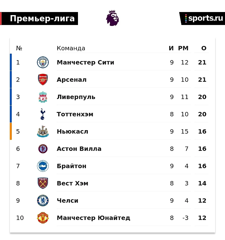 «Арсенал» лидирует в лиге вместе с «Ман Сити». По очкам сравнялись, потому что команда Пепа Гвардиолы в туре победила, действующий чемпион выше претендента только по дополнительным показателям.