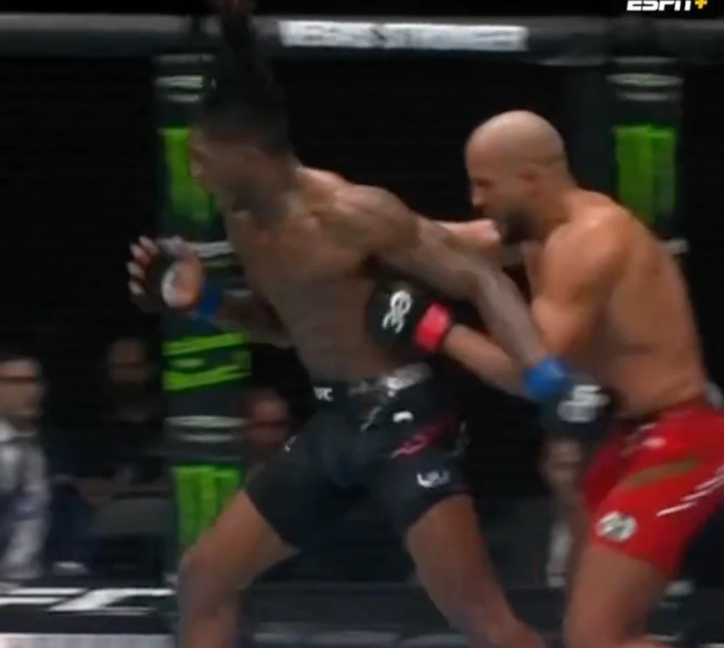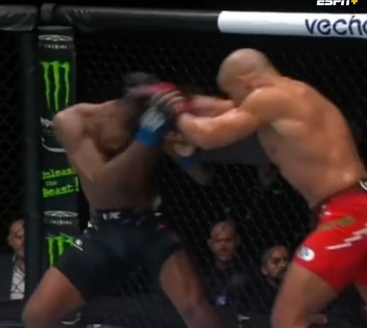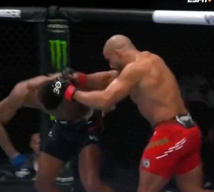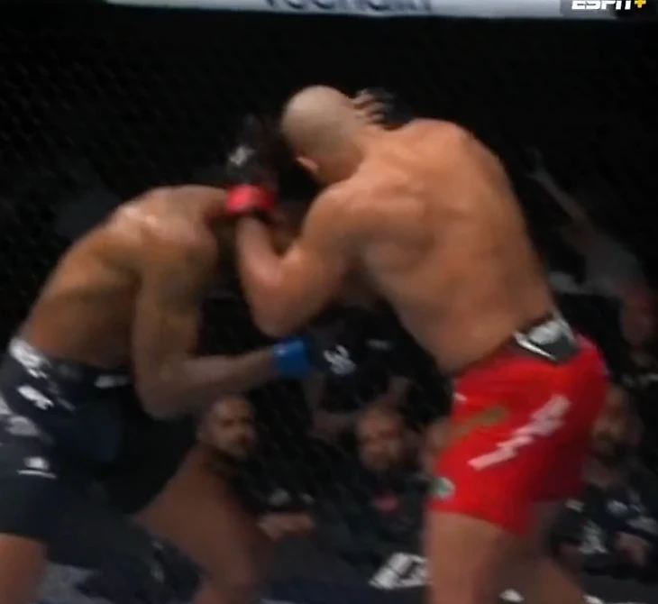 Безумный момент из боя Седрика Думаса и Абу Азайтара. По ходу поединка марокканец внезапно схватил Думаса за волосы – и начал наносить удары: