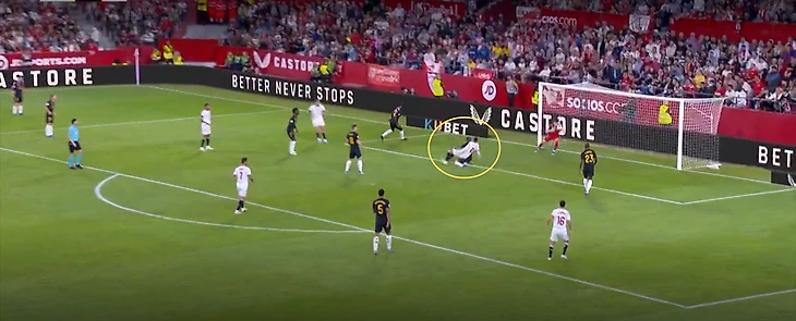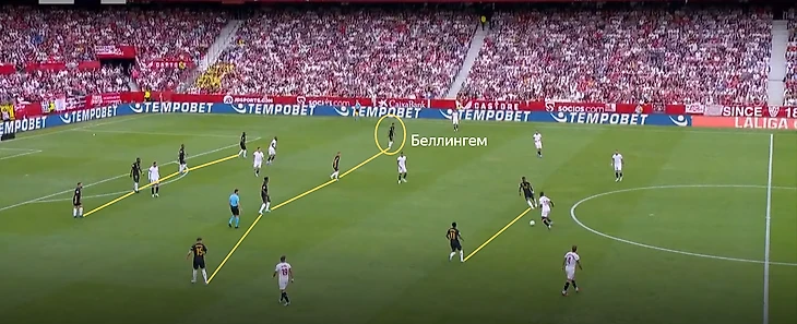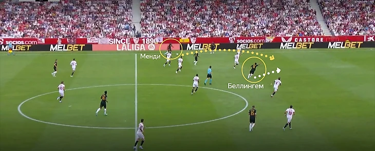 Много опасности у ворот соперника приносили действия Беллингема. «Севилья» часто действовала с высокой линией защиты, а Джуд отлично распознавал свободные зоны и пользовался ими. Здесь открылся под передачу Менди – эпизод закончился шансом Винисиуса.