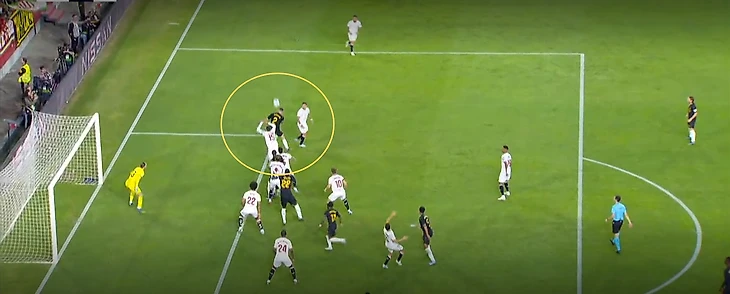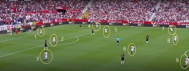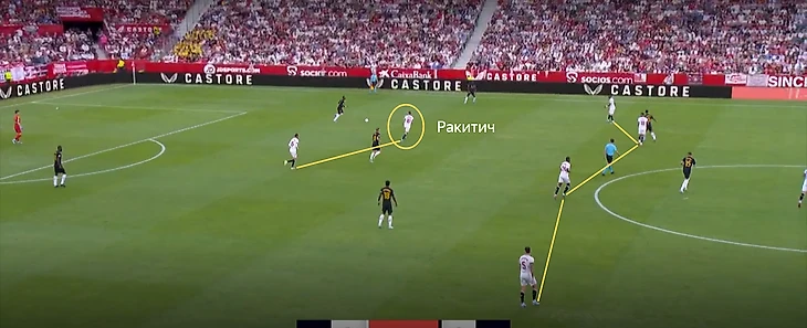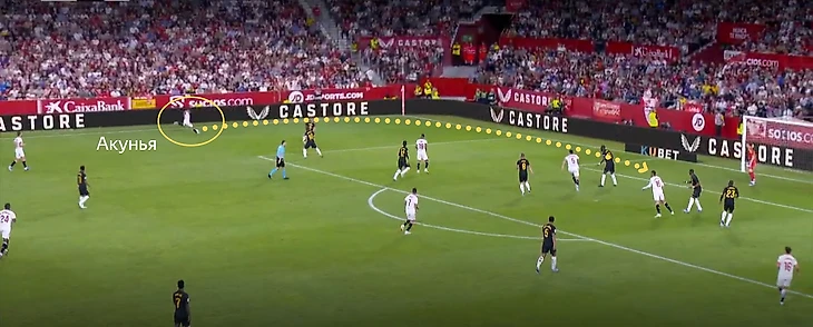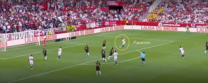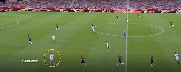«Севилья» также старалась не закрываться всей командой в своей штрафной, а действовать смелее и поддавливать соперника на чужой половине поля. В этом эпизоде сразу 9 игроков в кадре на чужой половине поля.