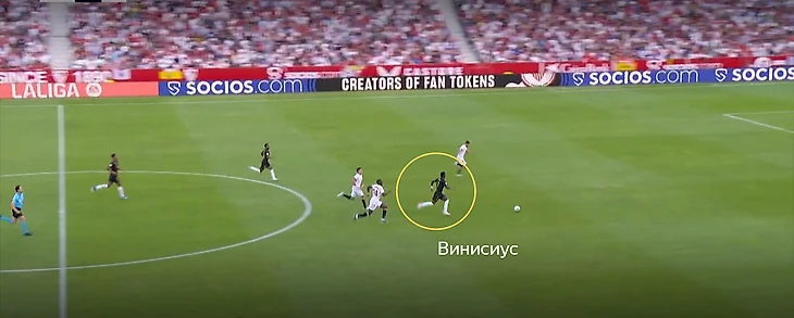 «Мадрид» активно использовал пространство за спинами защитников «Севильи». Быстрые Винисиус и Родриго этим пользовались (но без результата).