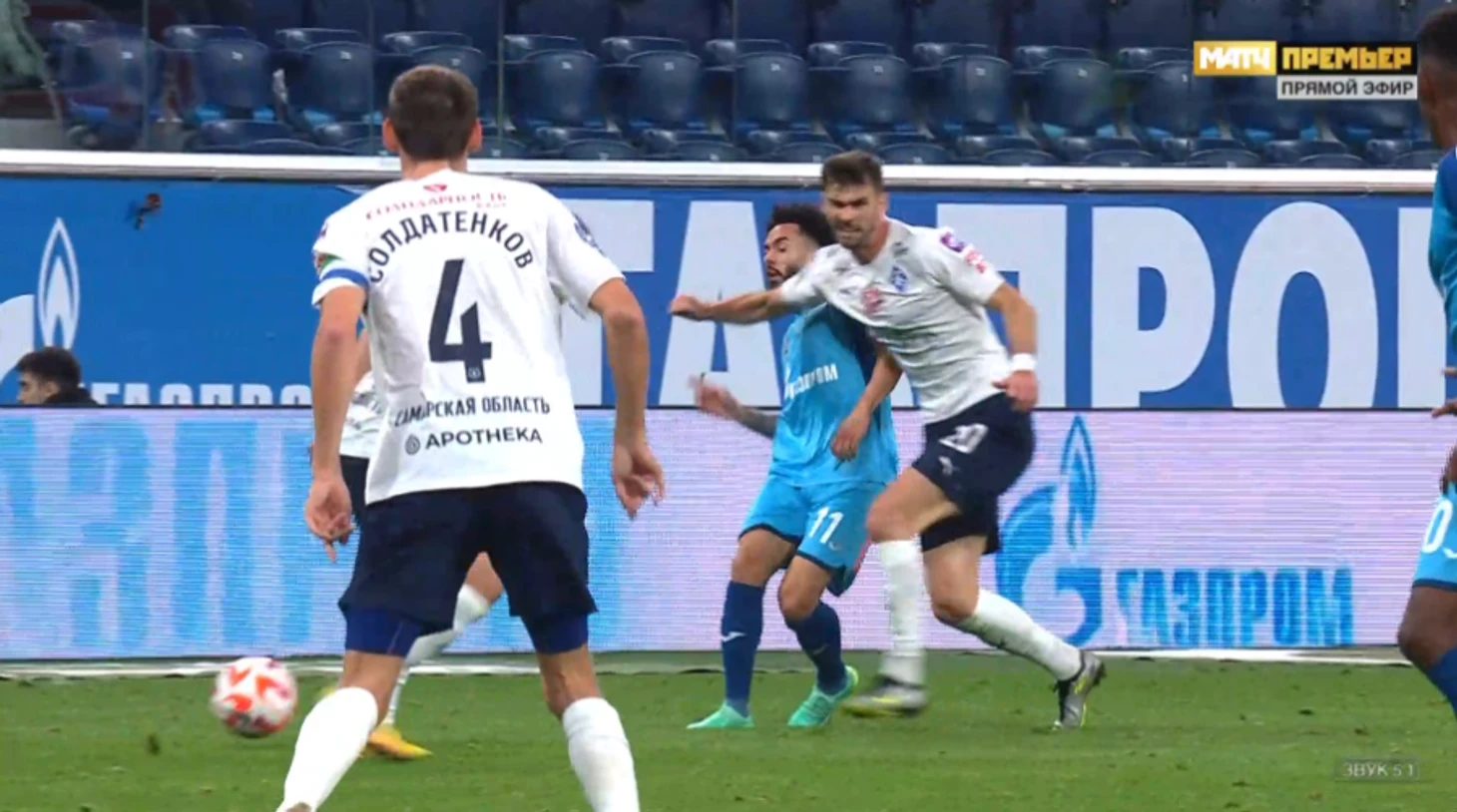 Один из спорных моментов матча «Зенита» с «Крыльями» – вот это единоборства Амара Рахмановича с Клаудиньо.