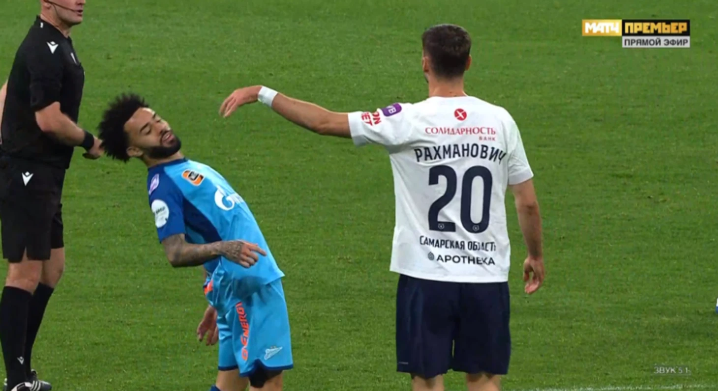 На повторе видно, как Рахманович побежал прессинговать Клаудиньо. И двинул ему в лицо.