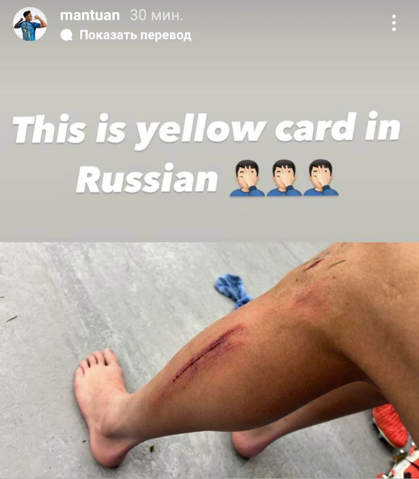 А после – и свою ногу. С ехидной подписью: «В России это желтая карточка».