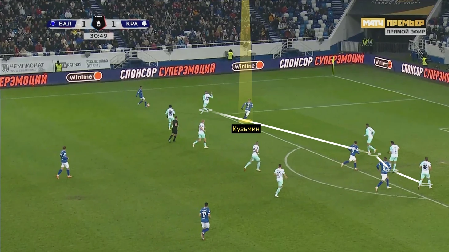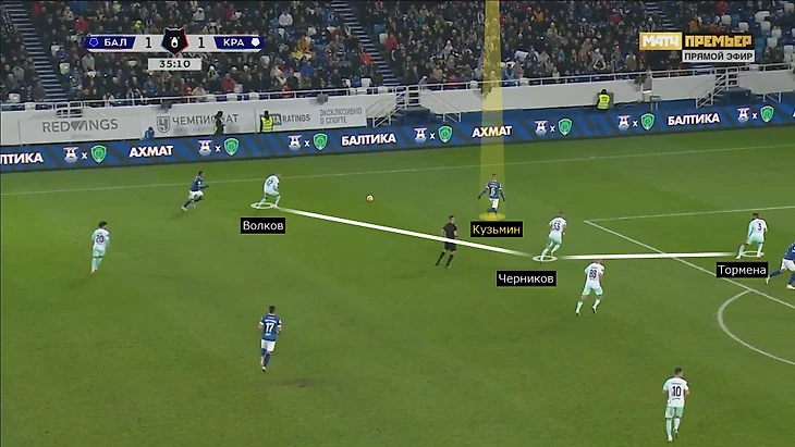 Фланг Сергея Волкова и Кади еще хуже – Ивич полностью его поменял в перерыве. Несмотря на ситуативную пятерку «Краснодара» при обороне, защита плохо контролировала ширину. С Баши мы разобрались, Волкову было сложнее. Если он выбрасывался на латераля Роберто Фернандеса, Кади его почти не страховал. При этом «Балтика» шикарно грузит штрафную, из-за чего центральный защитник Тормена оставался в паре с Хуниором Алонсо. Опорники зависали выше, поэтому пространство взламывал Максим Кузьмин.