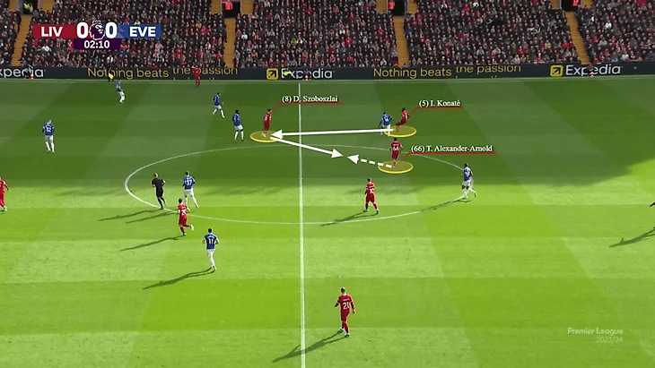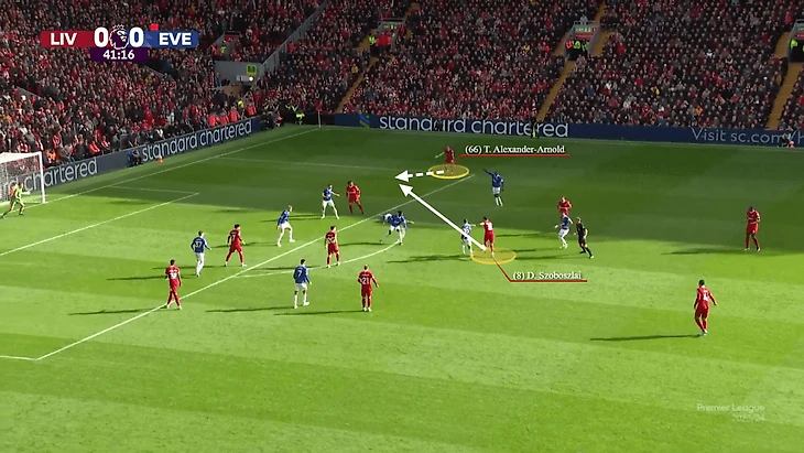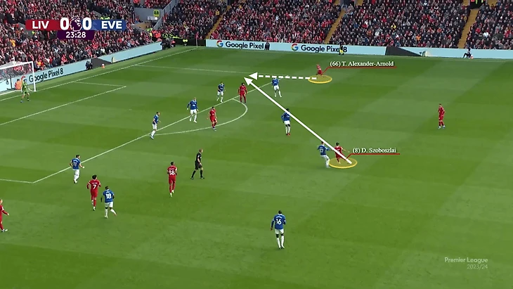 Теперь пространство раскрылось, и Собослаи очень близок к тому, чтобы отдать идеальный пас за спину выбегающему Александер-Арнолду.