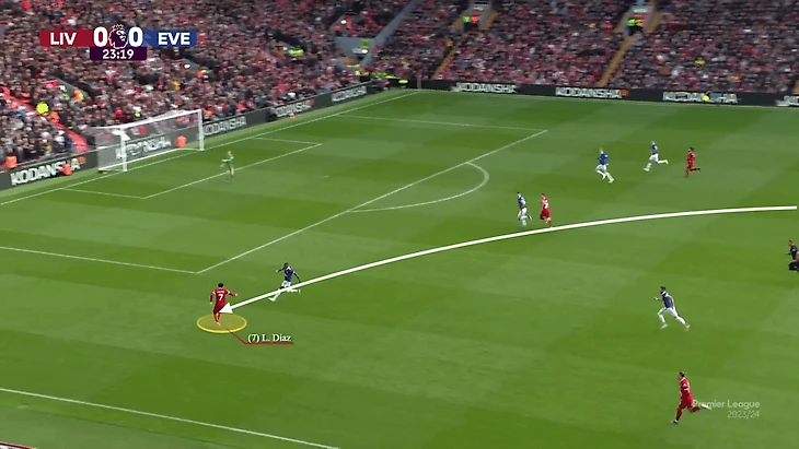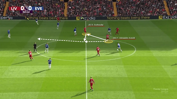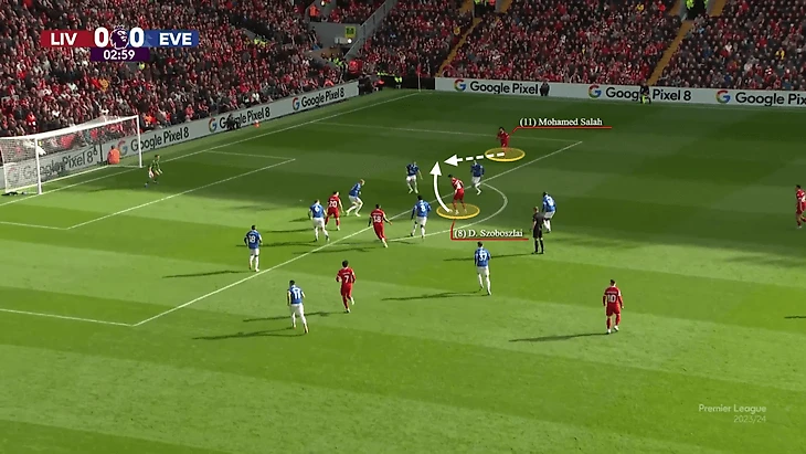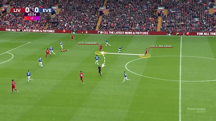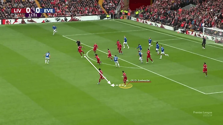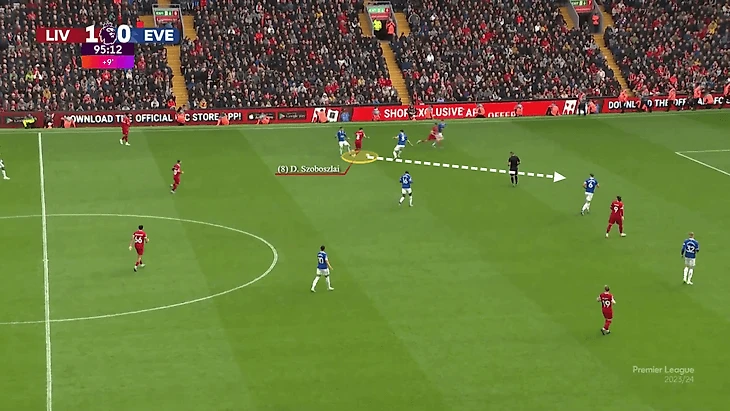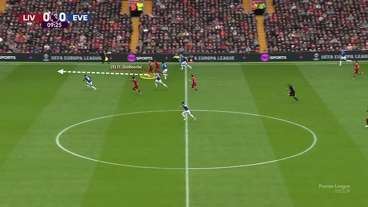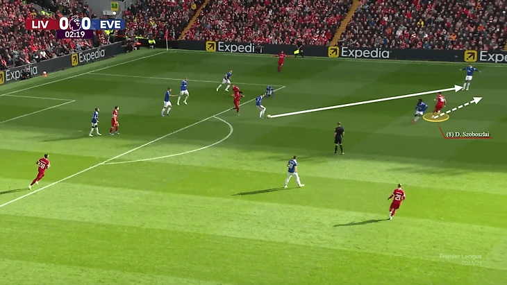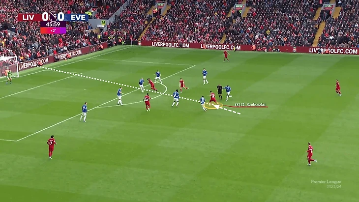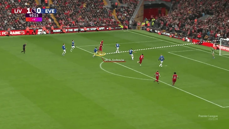 Шесть минут спустя он снова возглавляет атаку «Ливерпуля». На этот раз Собослаи выигрывает воздушную дуэль после подачи со штрафного и бежит за мячом, обходя игроков «Эвертона», которые начинали ближе к мячу.