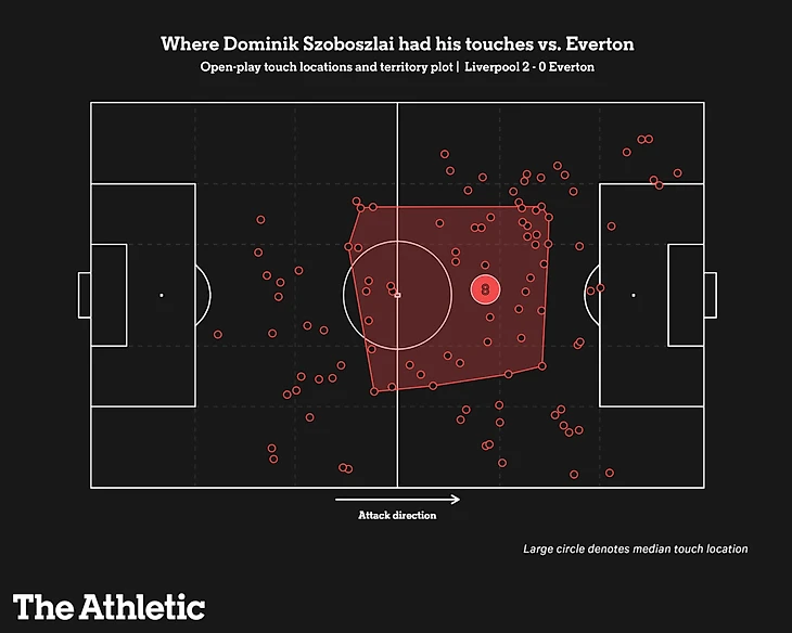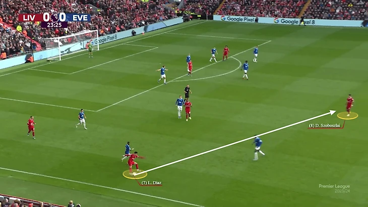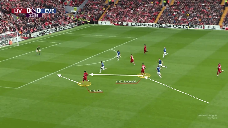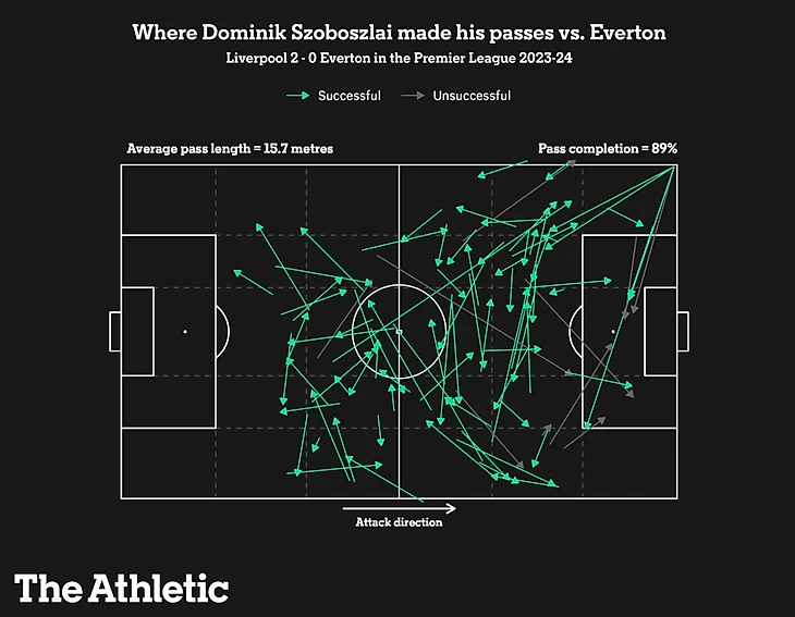 Пасовая карта Собослаи отражает изменения в игре: несколько его передач пришлись на штрафную площадку «Эвертона», когда он сыграл свою роль в попытке сломить их впечатляюще упрямую оборону. В конце концов, именно пас Собослаи позволил Диасу пройти по левому флангу, войти в штрафную и заработать решающий пенальти после игры рукой Майкла Кина.