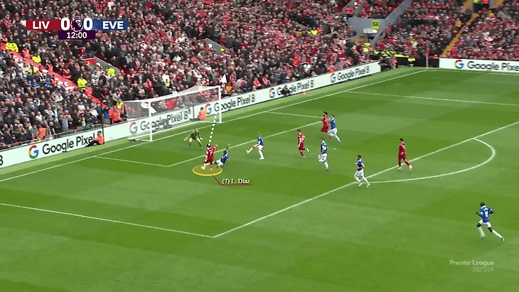 Несмотря на то, что он действует на максимальной скорости, он выбирает правильный вариант, отдавая идеально взвешенный пас на ход Луису Диасу...