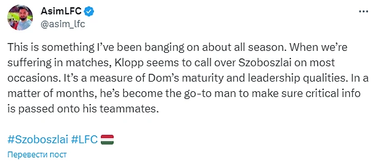 «Это то, о чем я твержу весь сезон. Когда матч идет не по плану, Клопп в большинстве случаев обращается к Собослаи. Это показатель зрелости и лидерских качеств Дома. За считанные месяцы он стал человеком, который всегда готов передать важную информацию товарищам по команде».