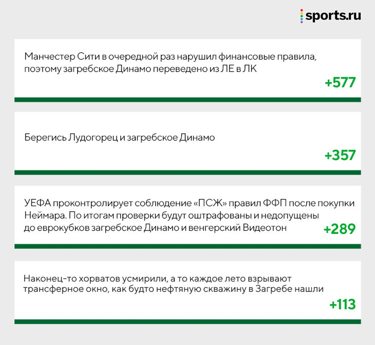 Шутка прекрасно работает и с другими скромными командами, чаще всего из Восточной Европы: «Работничками», «Стяуа», «ЧФР», но главный конкурент «Лудогорца» (180 упоминаний в новостях про ФФП) – это загребское «Динамо» (163).