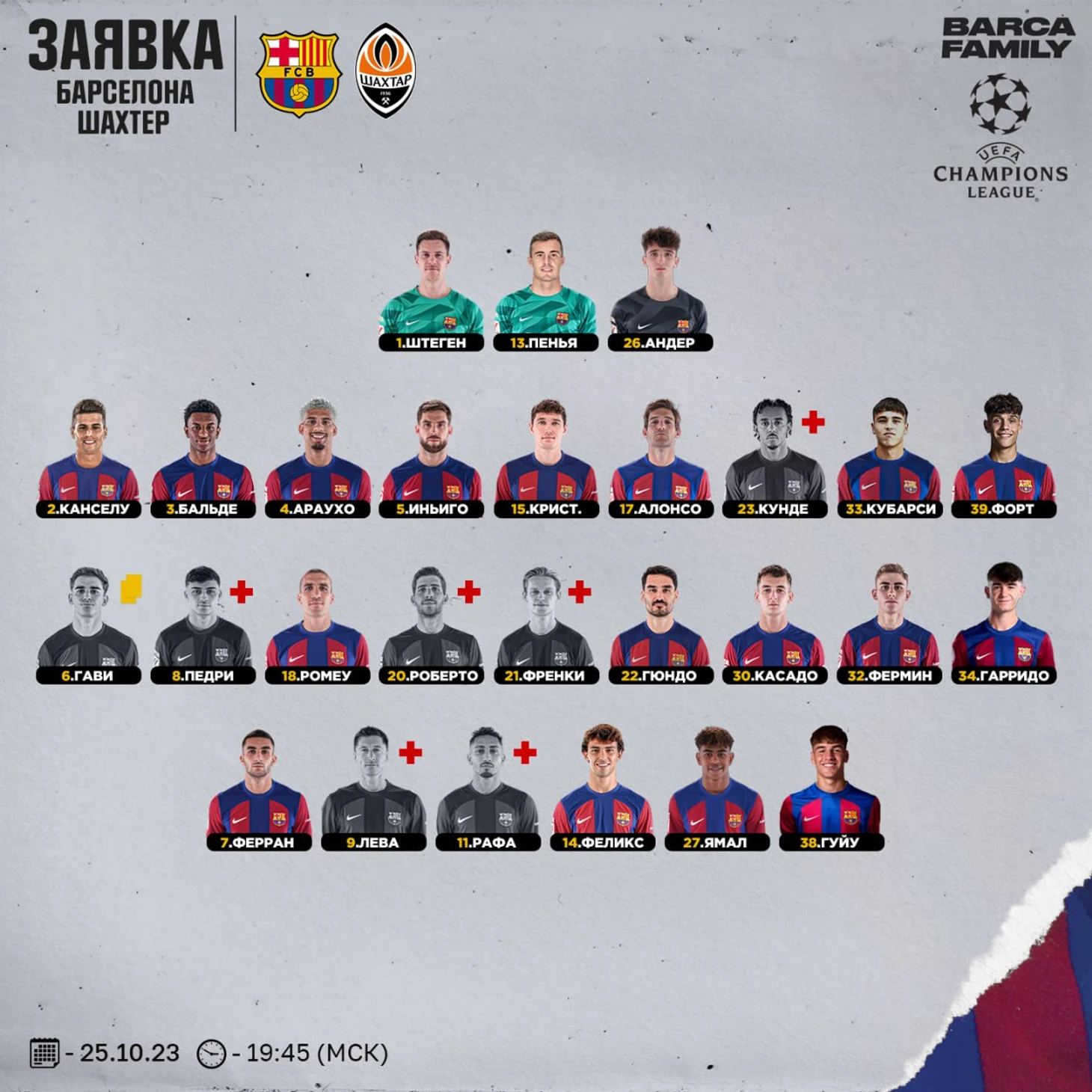 В заявку, по причине травм, не попали: Кунде, Педри, Роберто, де Йонг, Левандовски, Рафинья. Гави – пропускает игру из-за красной карточки, которую он получил в матче против «Порту» Так что с выбором здесь особо не разгуляешься. А в конце недели еще и Эль-Класико.