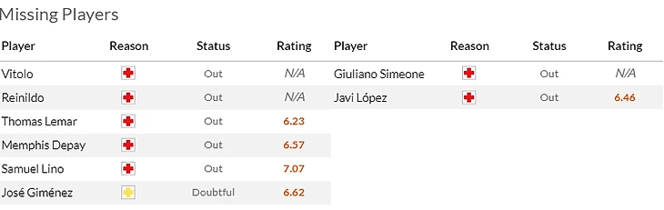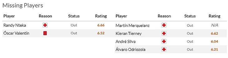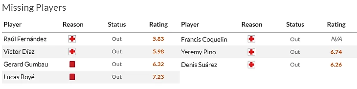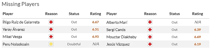 Что касается гостей, то тут тоже есть сложности с защитниками, но не такие трагические: пару недель пропустит Хуан Крус(5,5) плюс под вопросом выезд в Севилью не совсем здорового Мохики(5,5).