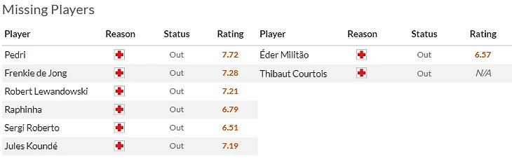 На что обратить внимание: На кадровые потери Барселоны. К Эль Класико каталонцы подходят изрядно потрепанными, но Хави сегодня подтвердил что и Роберт Левандовски(10) и Френки Де Йонг(7), готовы сыграть против Мадрида.. но не сказал, скока..) Также Блауграна до сих пор надеется увидеть на поле Педри(7,5) и Кунде(6,5) и тихо радуется тому, что в общую группу вернулся Рафинья(8), а повреждение, которое Жоау Феликс(8) получил в Лиге Чемпионов оказалось несерьезным .