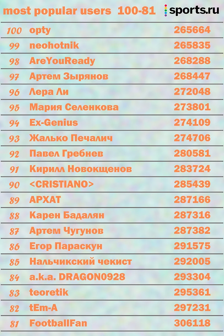 В данном посте представлен топ-100 самых популярных пользователей трибуны «Спортс.ру», (для наглядности в картинках) на основе их общего рейтинга - правый столбец. Ну и плюс небольшая попытка в статистику по ходу дела.