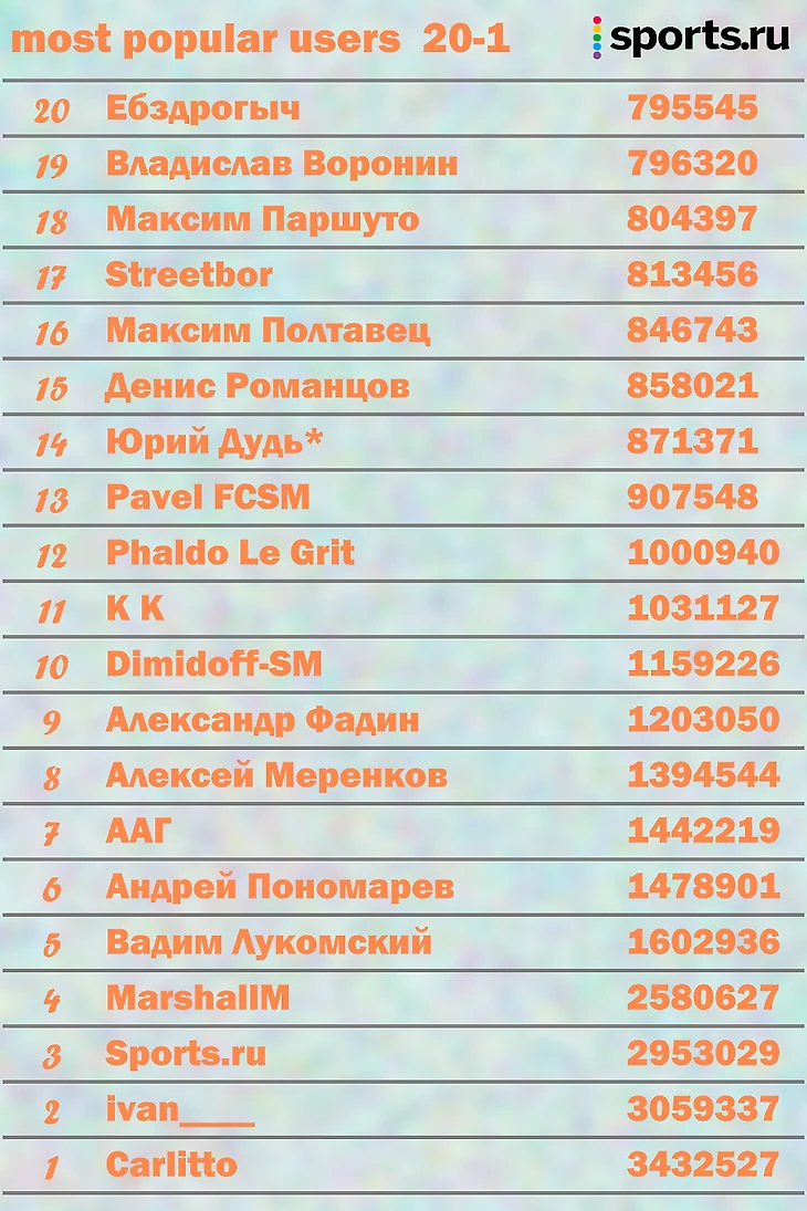 Что касается друзей, то я не вполне знаю, как работает данная опция. Но вроде как каждый может добавить каждого, а значит этот показатель так же отражает популярность. По количеству друзей лидируют: Вадим Лукомский 5708 приятелей, Василий Уткин 5902 товарища и абсолютный лидер Юрий Дудь* 11479 корешей. Если в обратную сторону, то получаем: Артем Чугунов 8 друзей, Алексей Федоров 6 братишек, и Жалько Печалич с 3 камрадами закрывает рейтинг.