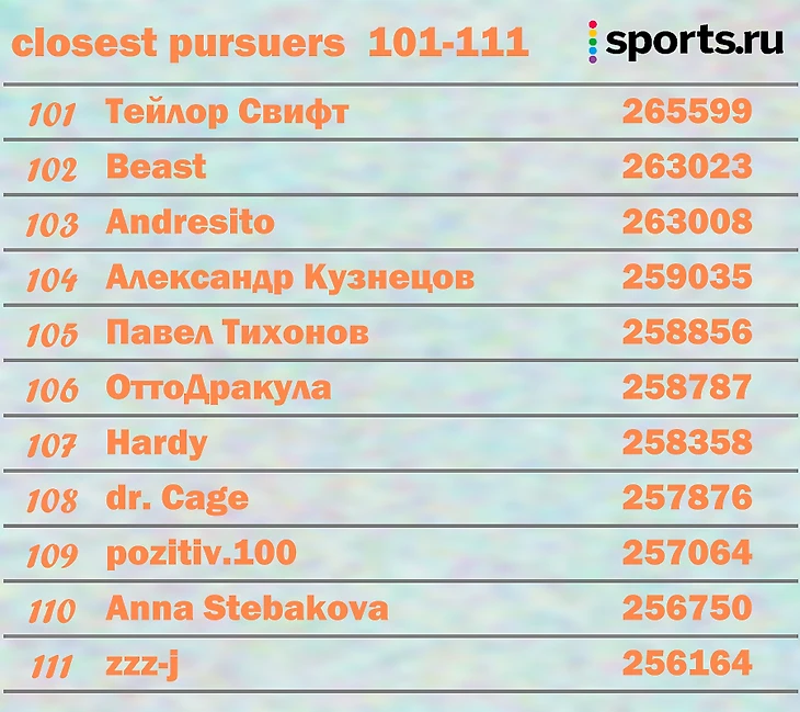 Ну и по итогу небольшой бонус в виде ближайших преследователей. Список из 11-ти пользователей, которые вот-вот ворвутся в высшую лигу и потеснят сегодняшних лидеров. Ну или вернутся. Ведь вполне возможно кто-то из них уже был там ранее, просто вывалился, временно сдав свои позиции. Есть что наверстать, равно как и есть что удерживать.