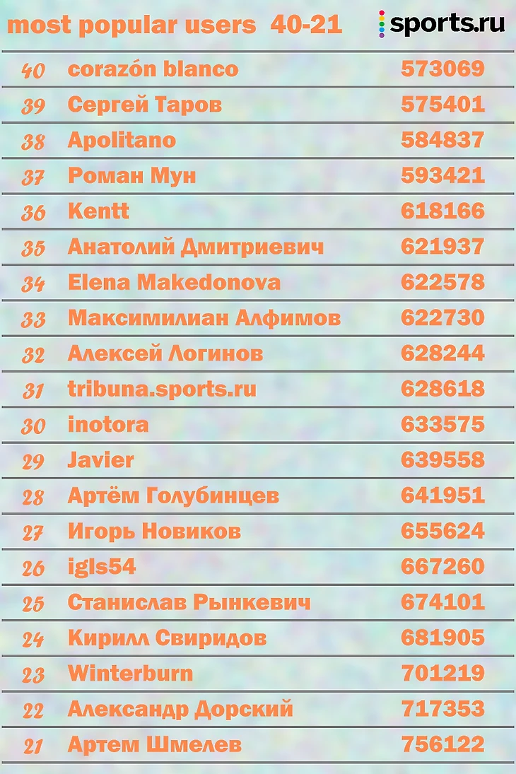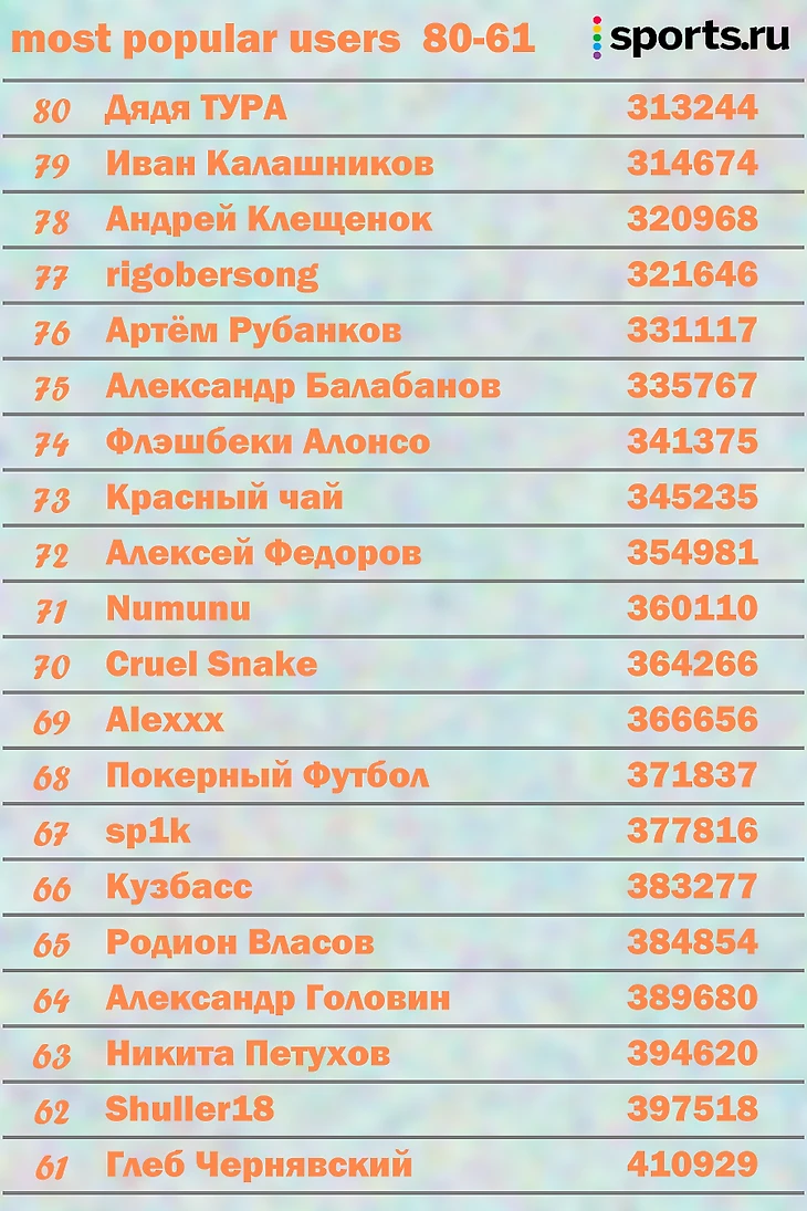 Наверное каждый из нас, рядовых пользователей «Спортс.ру», бросая беглый взгляд на свой рейтинг на платформе (меланхолично вздыхая от невозможности минусовать), невольно задавался одним простым вопросом: если на сайте предусмотрены места и ранжирование, то должны иметься и свои лидеры? Да, все верно! Как и у любой локальной горы) Пару дней назад меня посетили подобные мысли и захотелось выяснить, что там и как. Но увы, ресурса где можно было бы посмотреть данную информацию, обнаружить не удалось. Что ж, не беда! Тем интереснее было заморочиться и самому состряпать список самых-самых, а заодно дать представление о том, есть ли возможность пробиться новичку если не в десятку, то хотя бы подвинуть кого-то из первой сотни.
