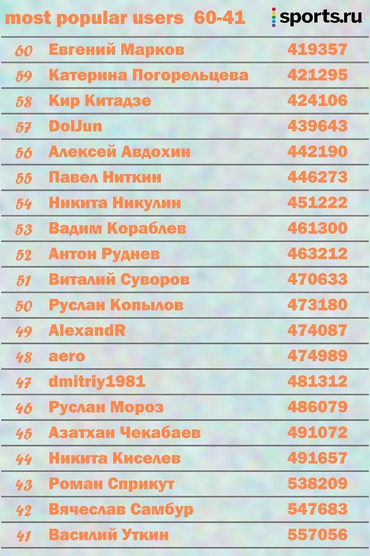Если обратить внимание на дату регистрации каждого, то получим кое-что интересное. Несколько человек из топа пришли на сайт в один и тот же день - 10.04.2007. Видимо, тогда на «Спортс» стало возможно создавать аккаунты. Главные «олды»: Василий Уткин, Денис Романцов, Станислав Рынкевич, Роман Сприкут, AreYouReady и Javier. Что же касается недавних пользователей, то самыми «фрешами» здесь будут: Cruel Snake 27.01.2019, Катерина Погорельцева 18.04.2021 и Алексей Федоров 19.05.2022 соответственно. Понимаю, из уст само вырывается: «Чегооо?!». Но я несколько раз все перепроверил и тут никакой ошибки нет. Дата создания аккаунта указана верно! А значит, что подняться в рейтинге вполне возможно любому! Хорошие новости для новичков) Вообще, стоит признать, что пробить топ-100 за неполные полтора года - достижение невероятное! Восхищает...