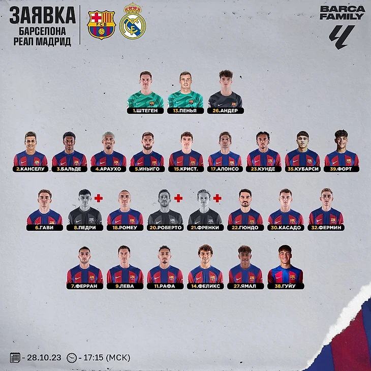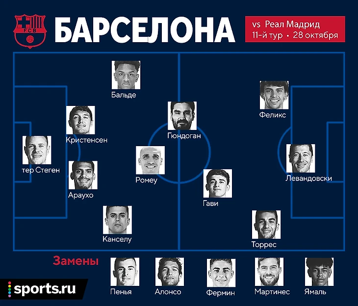 «Барселона» отстает от «Реала» на одно очко в преддверии «Эль-Класико», поэтому матч будет не только очень эмоциональным, но и важным с точки зрения результата. Главная проблема «Барсы» – травмы. За несколько дней до игры у команды восстанавливались шесть футболистов, но в заявку попали только трое: Левандовски, Рафинья и Жюль Кунде. Френки де Йонг, Педри.