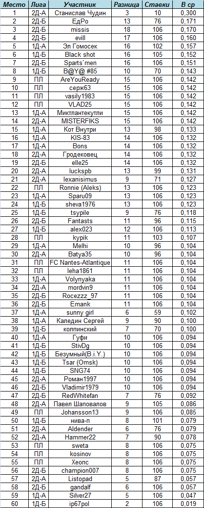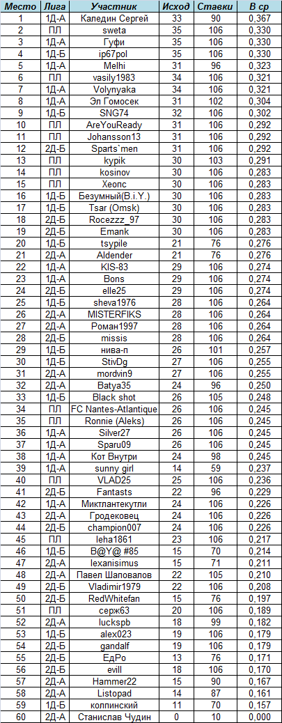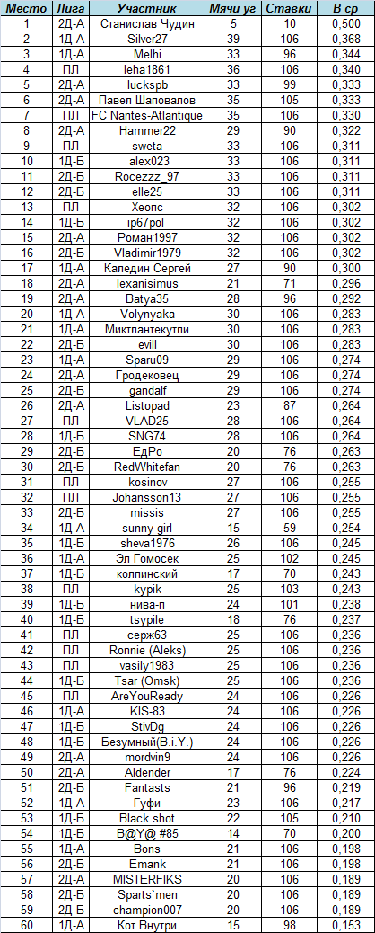Отметим присутствие в топе vasily1983, которому невезение на последних минутах многих прогнозных матчей превращало честно заработанные счета во всего лишь исходы.