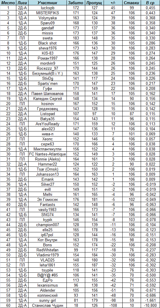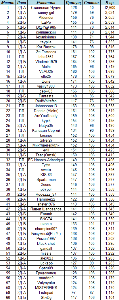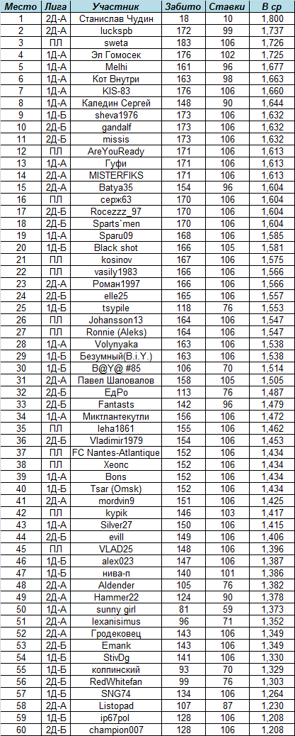 Впереди планеты всей ПЛ - лишь 3 пропущенных ставки на 12 человек за 11 туров! Всего было забито 8808 голов, или почти в среднем 1,5 очка получал каждый за одну ставку.