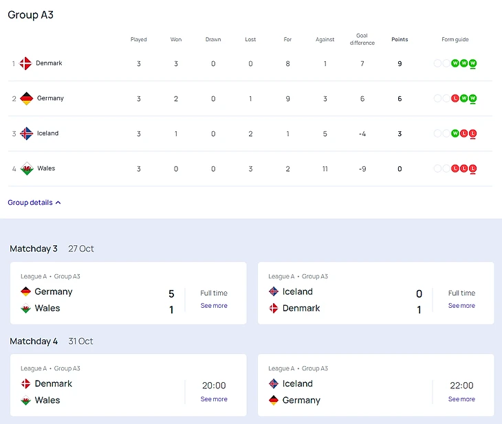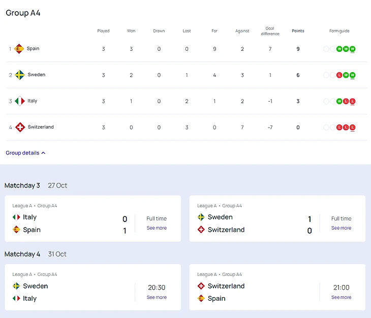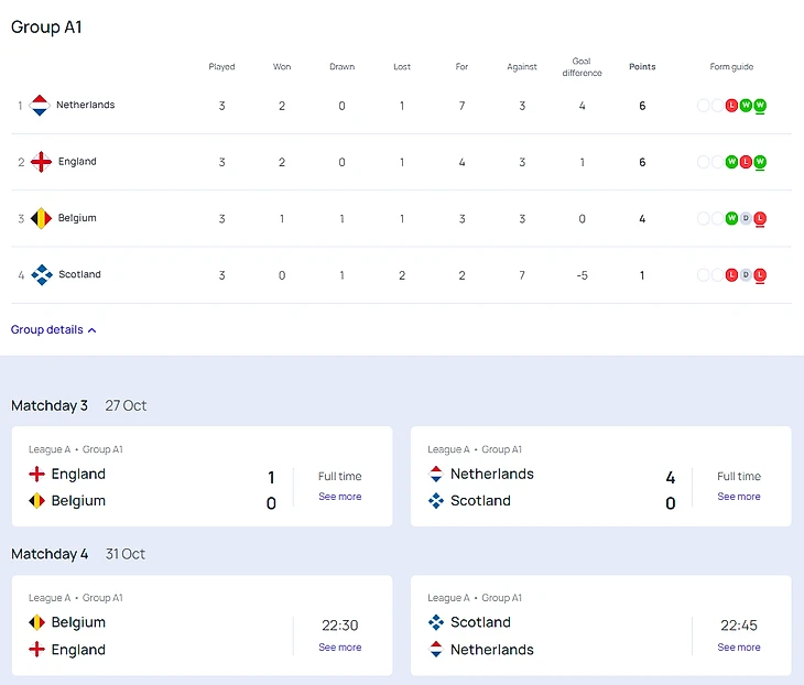 Таблицы групп Лиги А и расписание матчей (время московское):